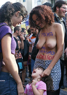 Agora, experimenta dizer a estas vagabundas (elas não se ofendem de serem assim chamadas, por supuesto) que criança pode, sim, levar palmadas dos pais, para sua educação e disciplina. Avançarão sobre quem o disser com unhas e dentes, berrando Violência! Mas consideram prova de amor pedagógico levar esta mesma criança ao circo de horrores, depravação, vulgaridade e indução à promiscuidade, exatamente o que é a Marcha das Vadias.